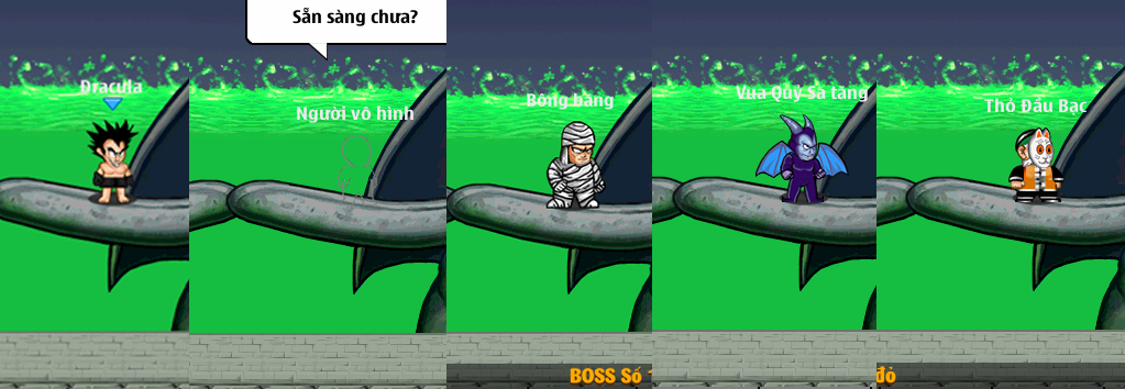 + Các nhân vật có thể đánh bại các Boss theo thứ tự: Sói héc quyn, Ở dơ, Xinbato, Tàu pảy pảy, khi tham gia đánh bại các Boss các bạn sẽ nhận được phần thưởng rương gỗ tương đương với Boss ở cấp độ đó
